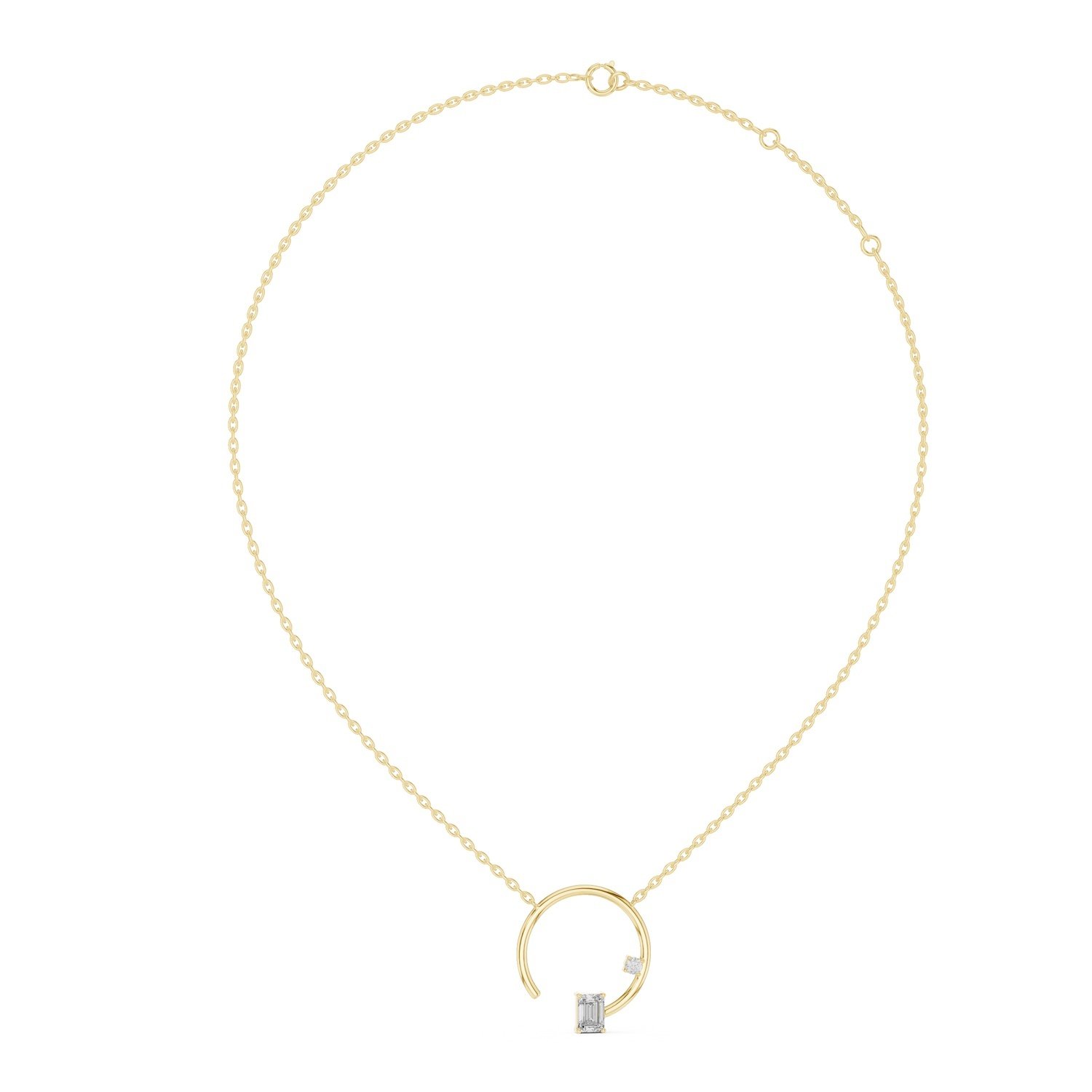 Showcasing one round diamond and one emerald-cut diamond with a combined weight of 0.98 carats, this pendant highlights the sparkle of the round cut and the sleek geometry of the emerald cut.