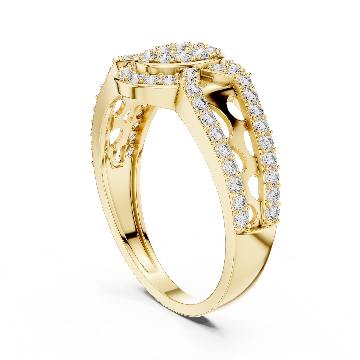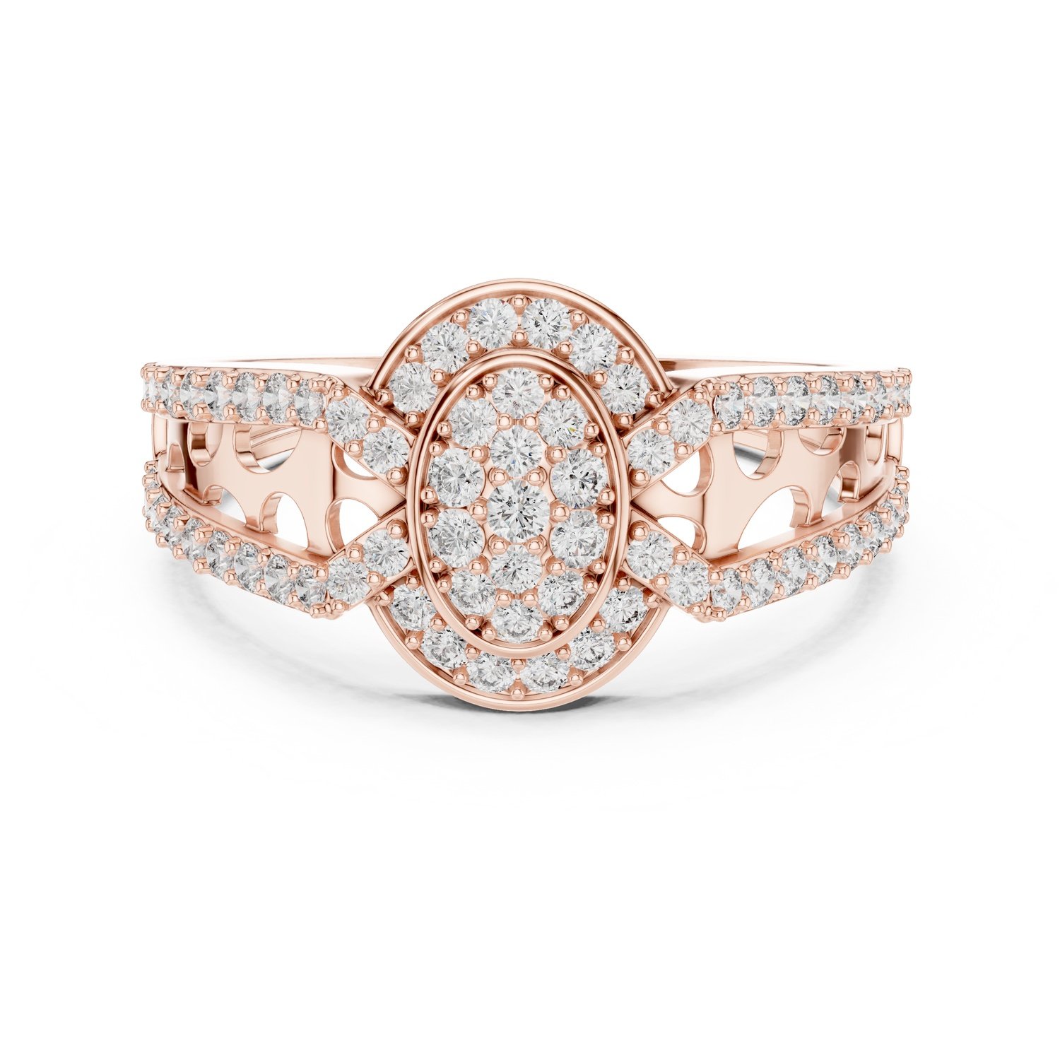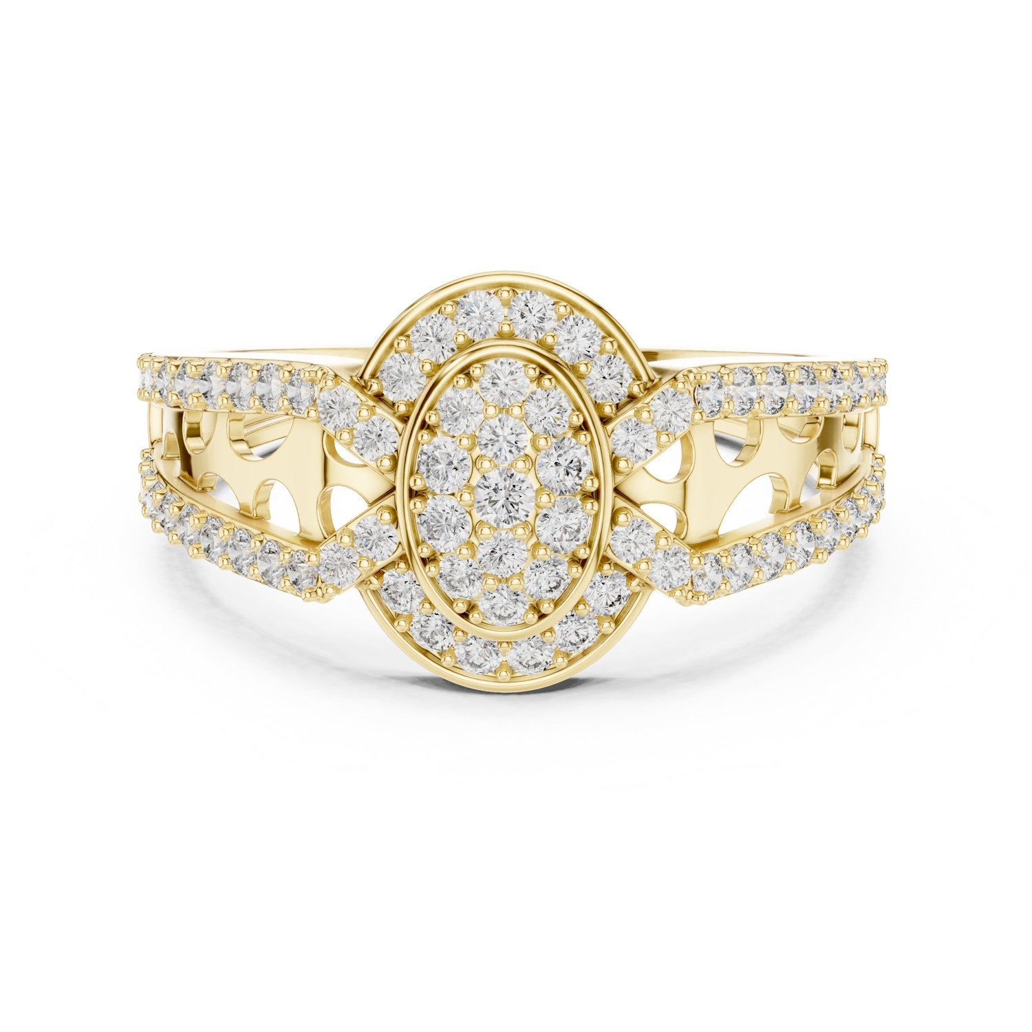 Shine like the stars with the Celestia Ring, featuring 69 lab-grown round diamonds (0.694 carat total). Designed with a radiant oval cluster surrounded by a sparkling halo and diamond-studded band, this masterpiece is available in 10kt, 14kt, 18kt, 22kt gold (white, rose, or yellow) and . A timeless ring for unforgettable moments.