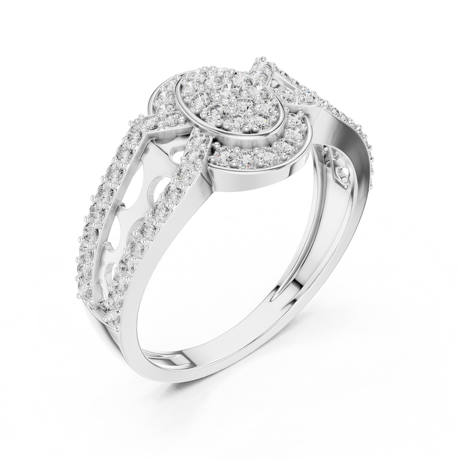 Oval cluster with diamond halo and side accents
